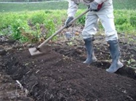 ・巾60~70㎝程のウネを立てます。水はけの悪い畑の場合はウネを高くします。