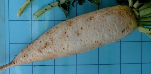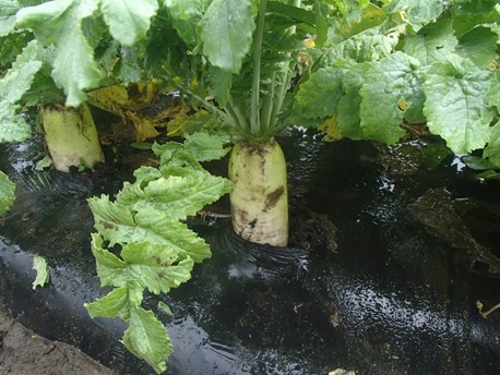 A大根は地中深くまで根を伸ばすので、土の中の雑物(石・肥料・ごみ)などに当たると股になってしまいます。また、根の先端が害虫におかされても同様に割れてしまいます。