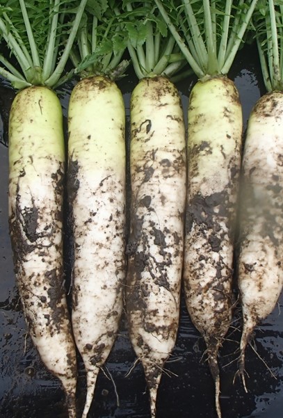 タネまきから50日前後、根径7cm前後に育ったものから収穫します。